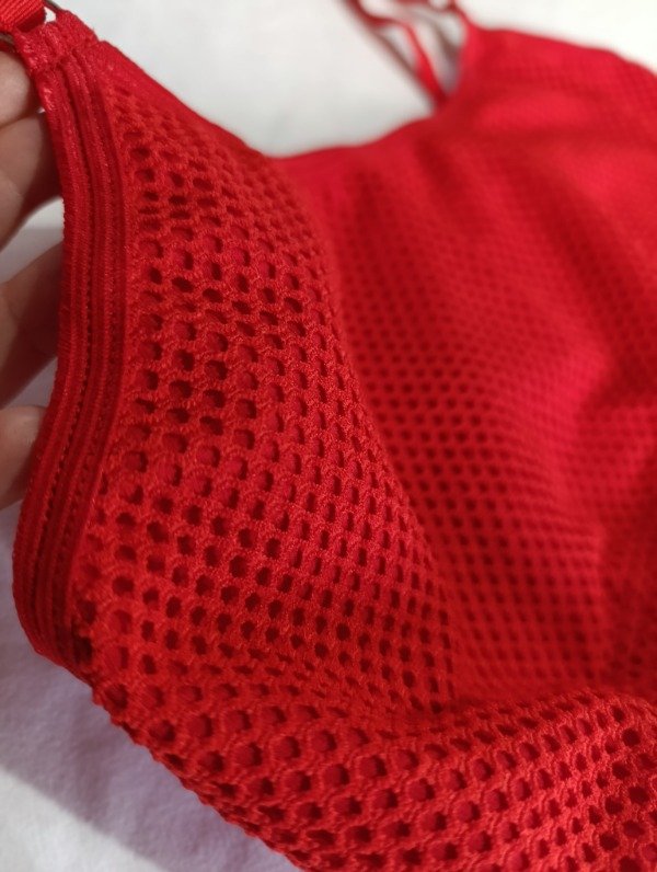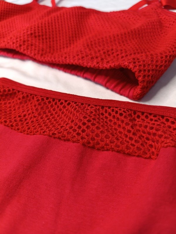 Top realizado en algodón con Lycra y reforzado en la parte delantera del busto con red elastizada , breteles regulables . Less tiro alto con transparencia realizada en red elastizada .
