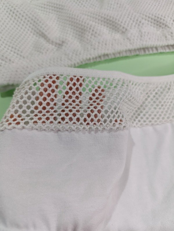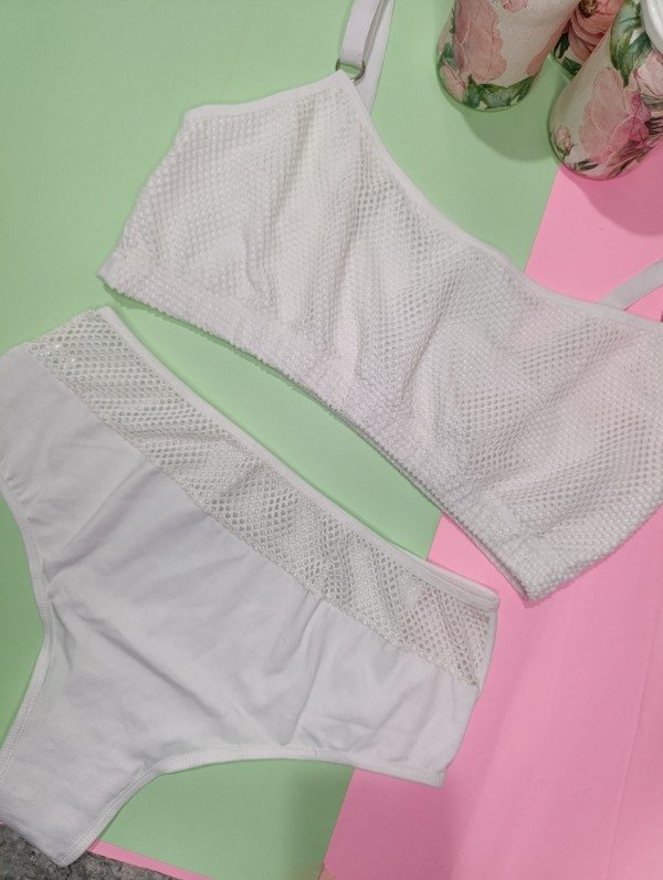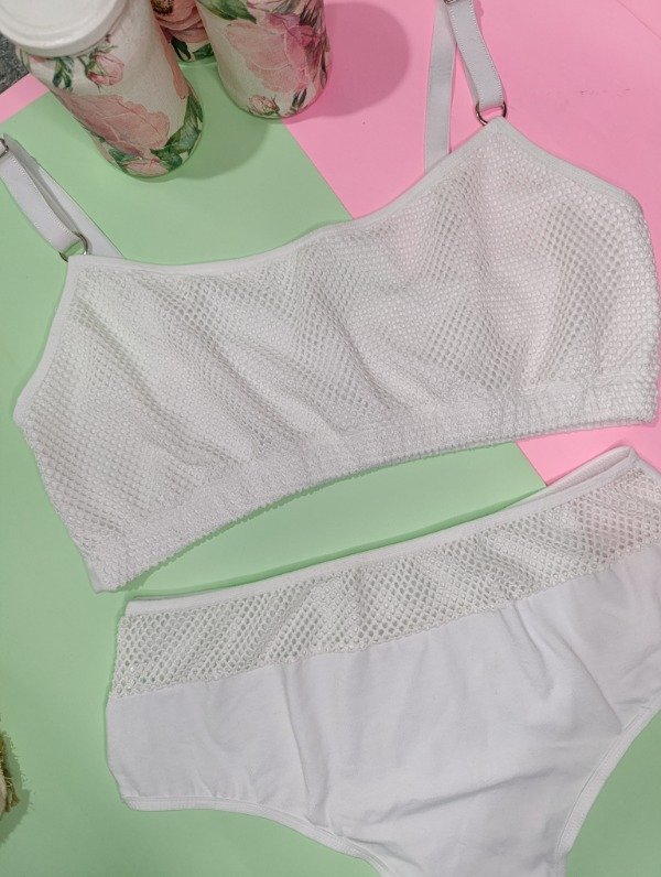 Top realizado en algodón con Lycra y reforzado en la parte delantera del busto con red elastizada , breteles regulables . Less tiro alto con transparencia realizada en red elastizada .