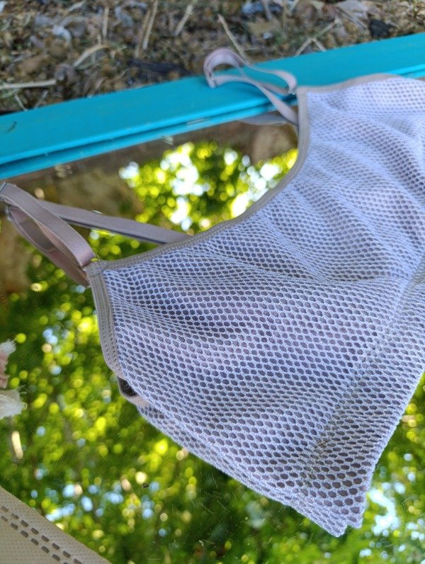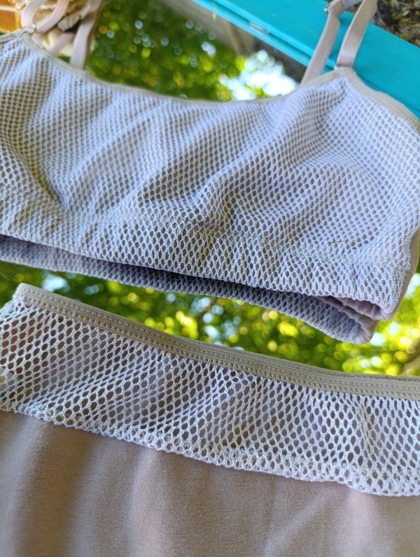 Top realizado en algodón con Lycra y reforzado en la parte delantera del busto con red elastizada , breteles regulables . Less tiro alto con transparencia realizada en red elastizada .